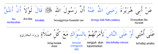 Artinya : “Diriwayatkan Abu Hurairah r.a. dia berkata : Rasulullah saw bersabda : Jika aku tidak menjadikan berat umatku, maka sunguh aku perintahkan bersiwak (mengosok gigi) setiap hendak shalat”. (HR Bukhari)